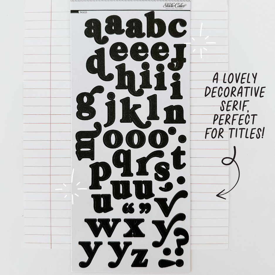 Add a bold, playful touch to your pages with our black alphabet sticker set! Featuring a chunky serif font with charming swashes and decorative curls, these letters make every word pop. Perfect for journaling, scrapbooking, cardmaking, or labeling your favorite things.
